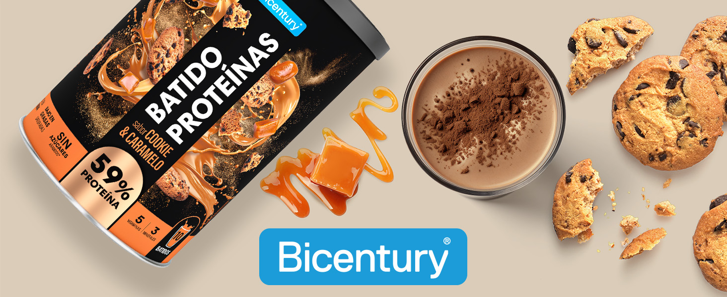 - Bicentury batido de proteína sabor Cookie & Caramelo, rico en fibra, sin azúcares añadidos, bajo en grasas, óptimo para la recuperación muscular, 340 g, 10 raciones.