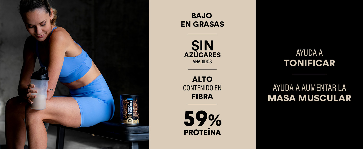 Proteínas hidrolizadas de TRIGO, proteínas de la LECHE, fibra alimentaria (inulina), LECHE desnatada en polvo, cacao desgrasado en polvo (1), aromas (colorante (caramelo amónico)), espesante (carboximetilcelulosa sódica), minerales (magnesio, hierro), edulcorantes (acesulfamo K, sucralosa), vitaminas (vitamina C, vitamina D, vitamina B6, riboflavina, ácido fólico). Puede contener APIO, SOJA y sus derivados.