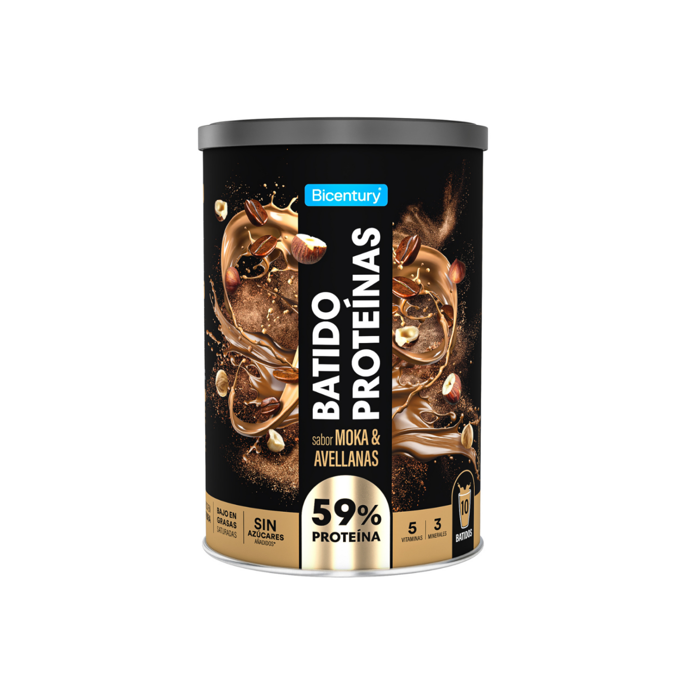- Bicentury batido de proteína sabor Café & Avellana, rico en fibra, sin azúcares añadidos, bajo en grasas, óptimo para la recuperación muscular, 340 g, 10 raciones.