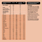 Proteínas hidrolizadas de TRIGO, aceite de SOJA en polvo (aceite de SOJA, jarabe de glucosa, proteínas de la LECHE, aroma natural), almidón, azúcar moreno de caña, azúcar, espesantes (goma xantana, goma guar), aromas, proteínas de la LECHE, minerales (potasio, magnesio, calcio, hierro, zinc, yodo, manganeso, cobre, selenio), vitaminas (vitamina C, vitamina E, vitamina B3, ácido pantoténico, vitamina A, vitamina D, tiamina, vitamina B6, vitamina B12, riboflavina, vitamina K, ácido fólico, biotina), colorante (carotenos).